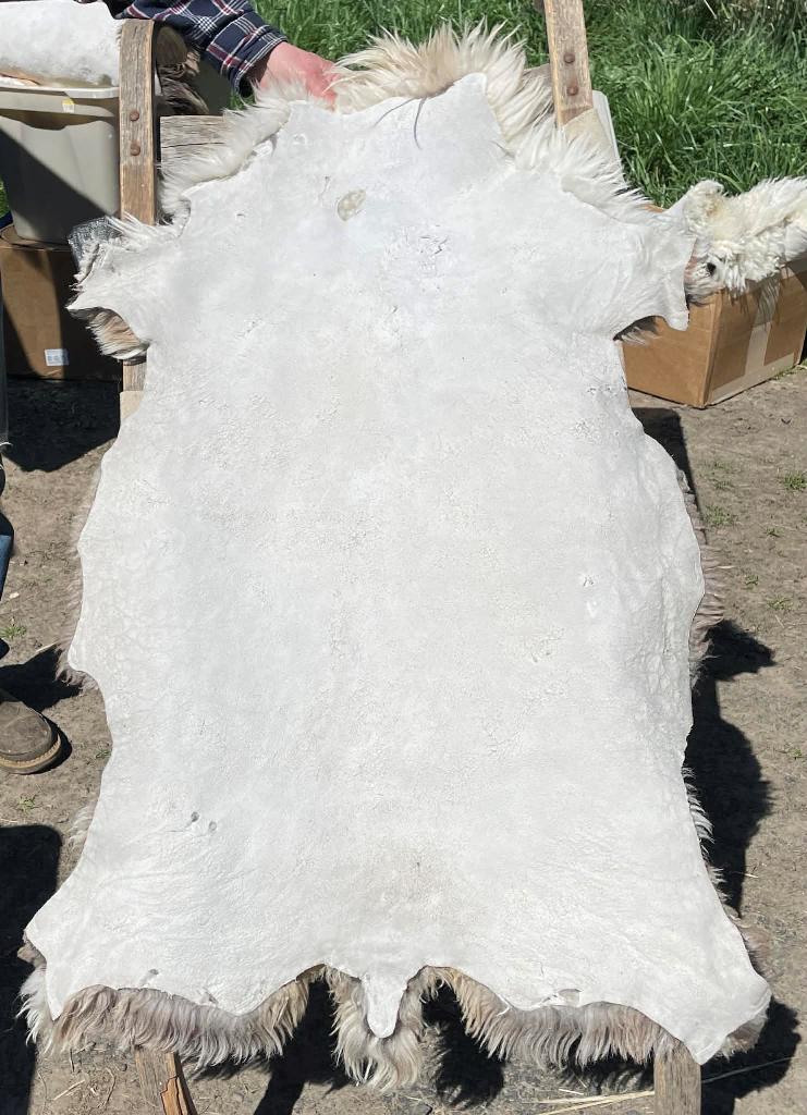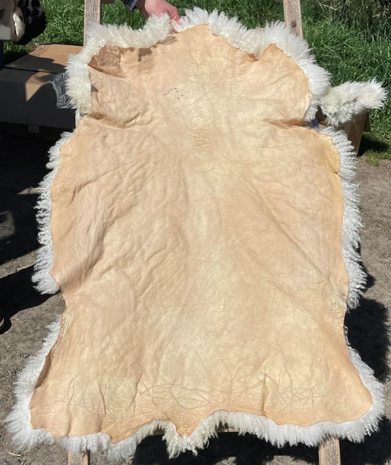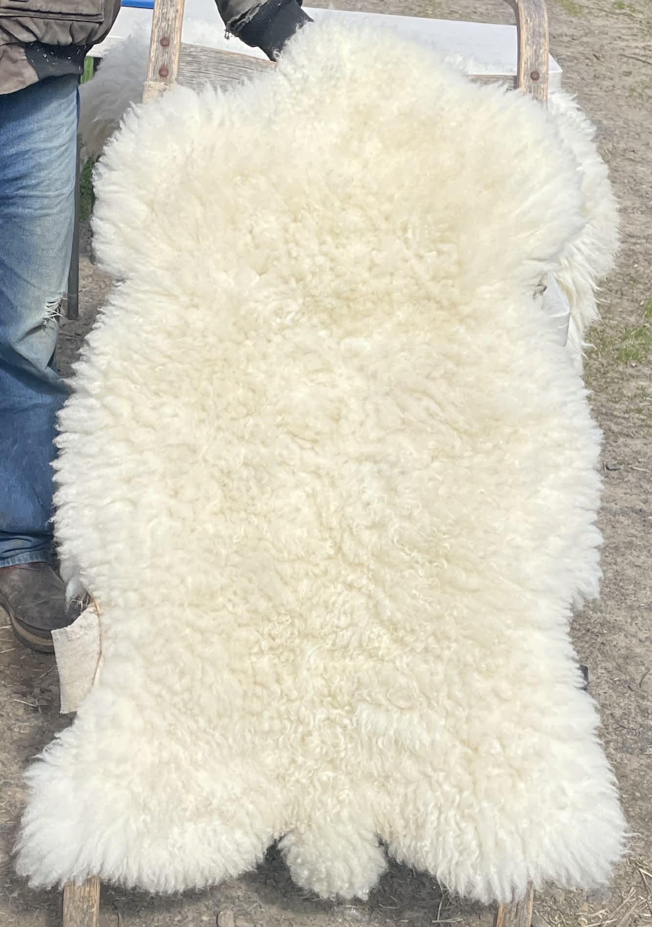 Pelt #S-BLX 1 Border Leicester x Gotland x Navajo-Churro $400* Color: White Dimensions: 47"L x 34" Lock Length: 3" Weight: 4 lbs 3 oz |