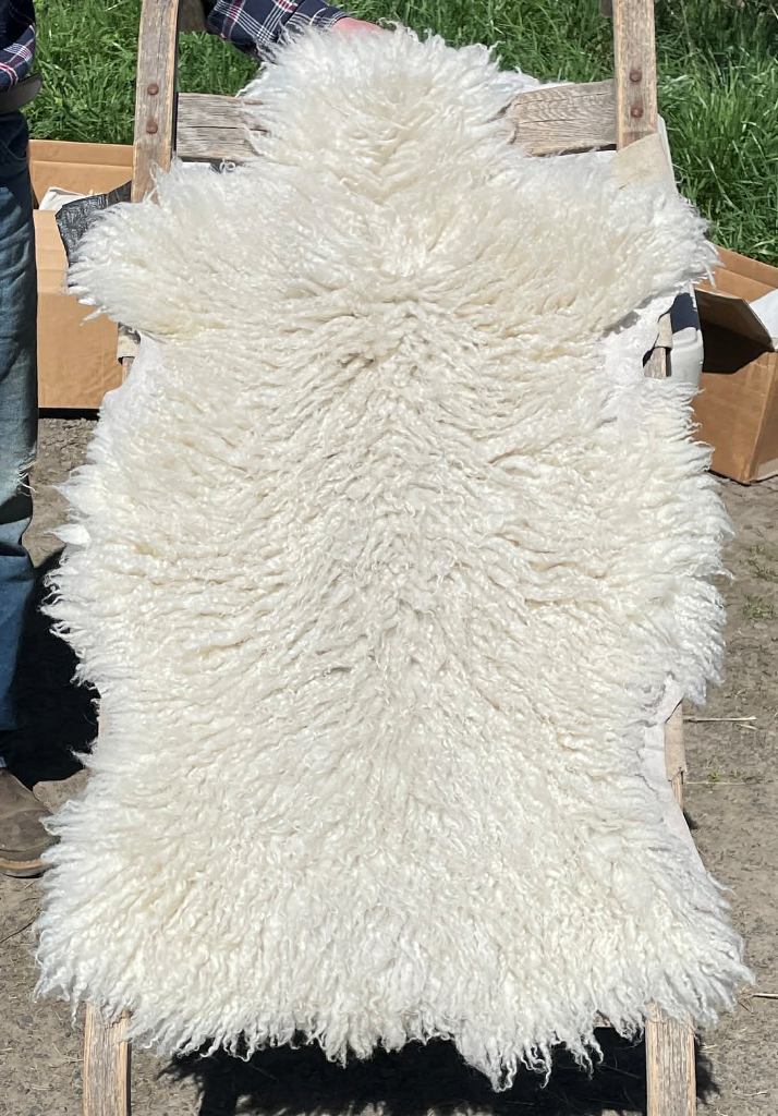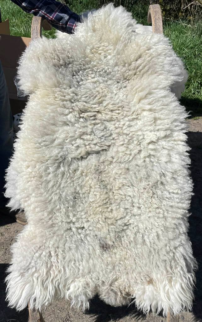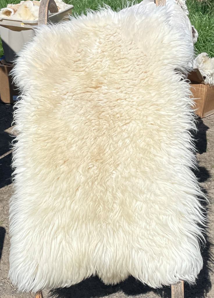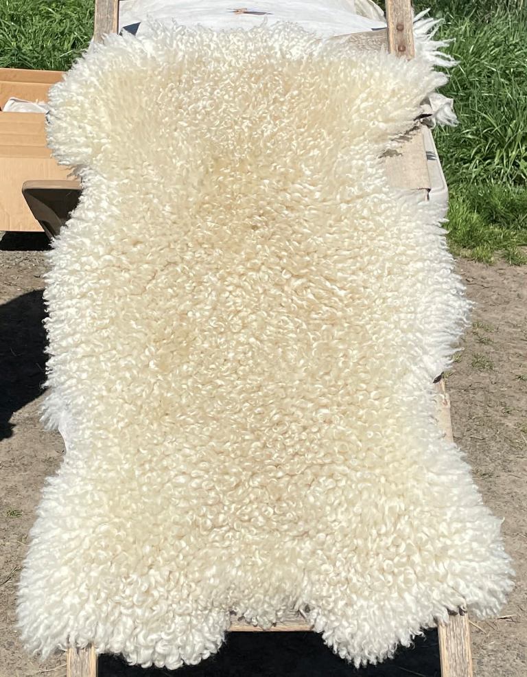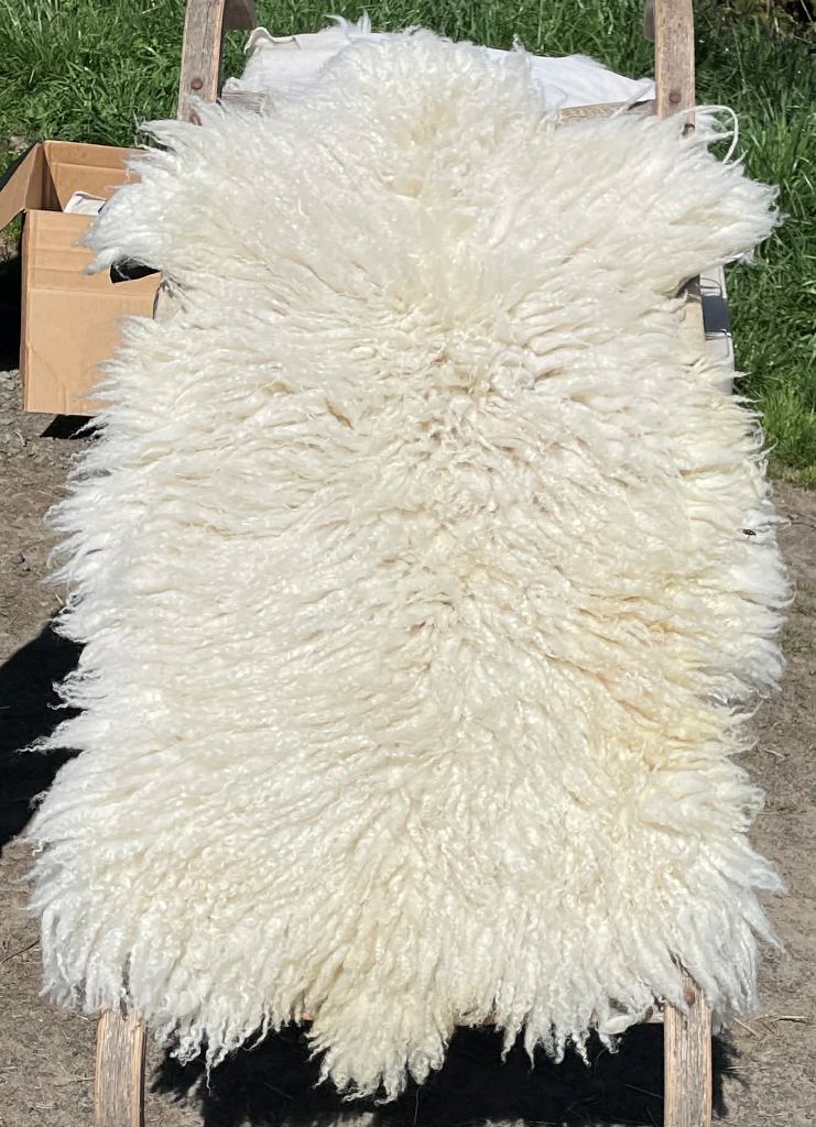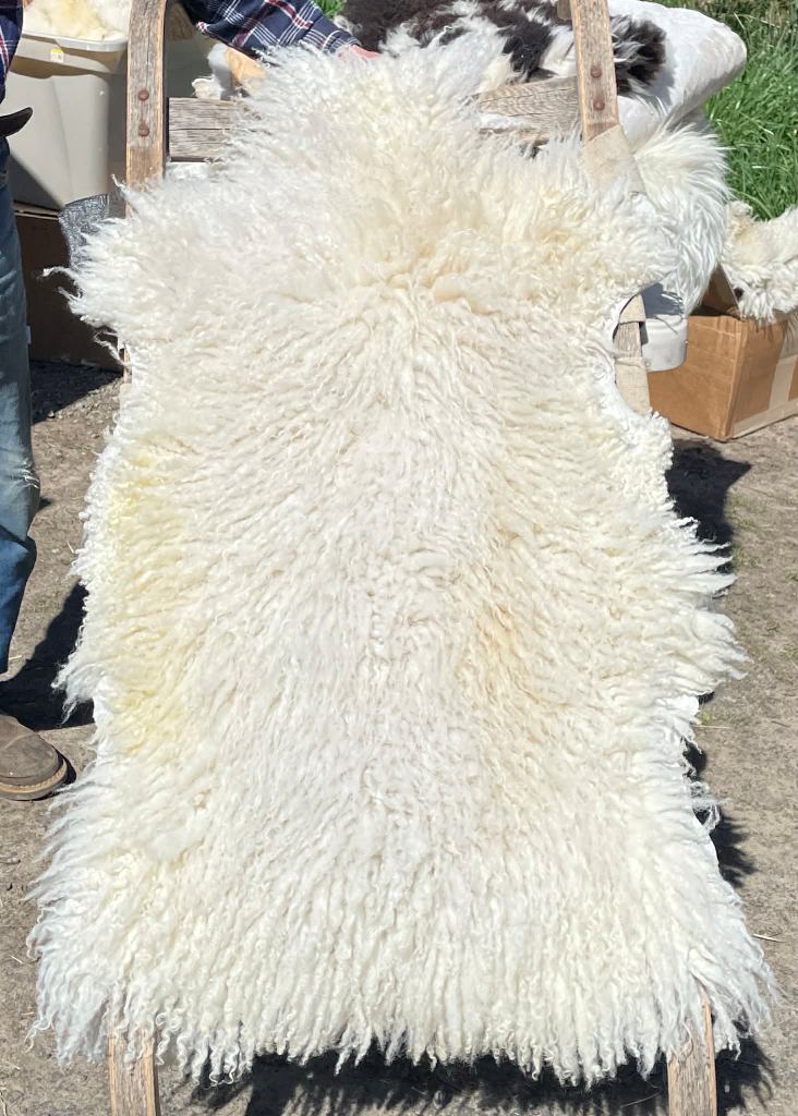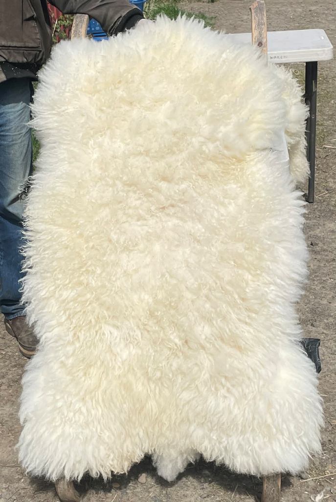 Pelt #B-X49 Border Leicester x Gotland x Navajo-Churro $350* Color: White Dimensions: 41"L x 31"W Lock Length: 4 1/2" - 5" Weight: 3 lbs 1 oz |