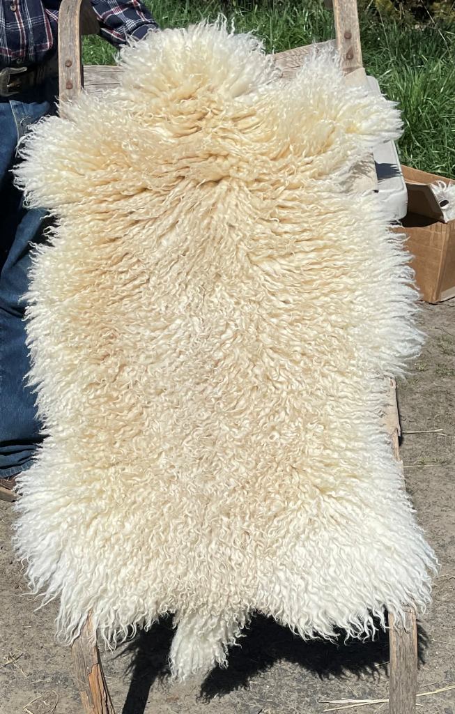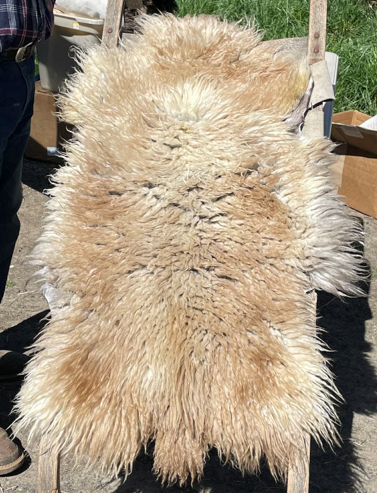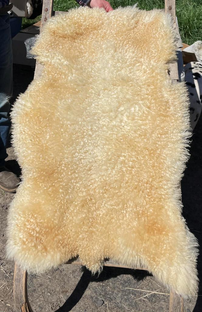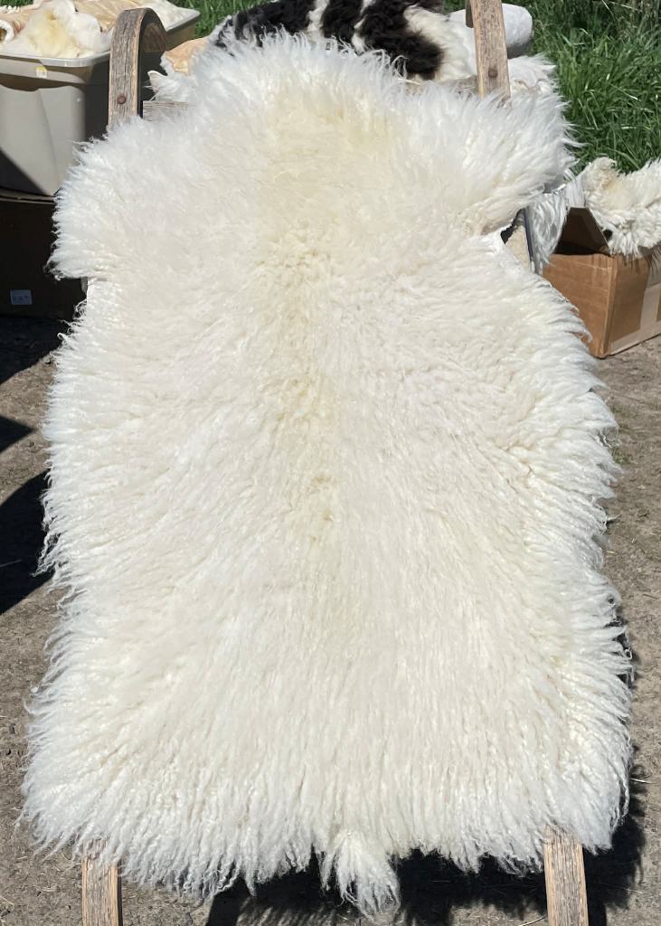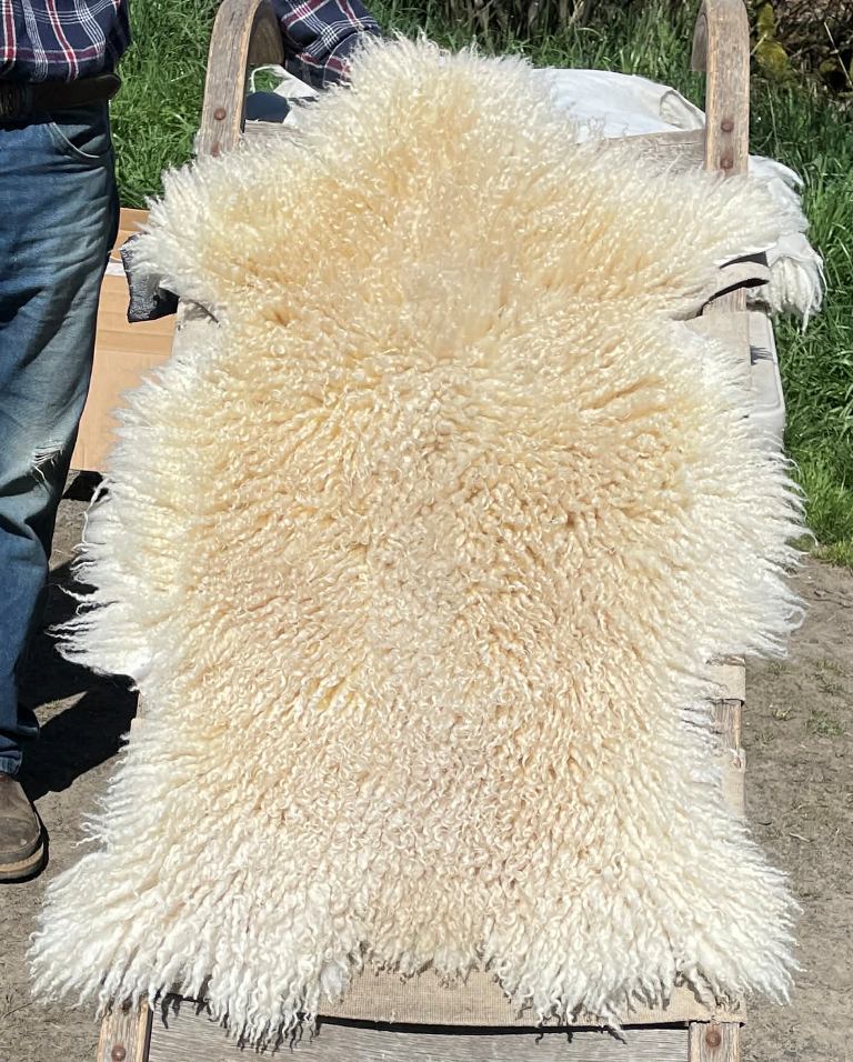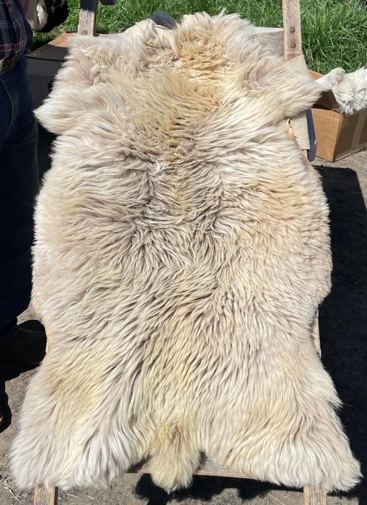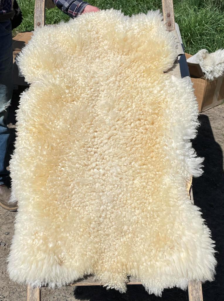 Pelt #B-X49 Border Leicester x Gotland x Navajo-Churro $350* Color: White Dimensions: 41"L x 31"W Lock Length: 4 1/2" - 5" Weight: 3 lbs 1 oz |