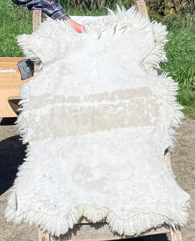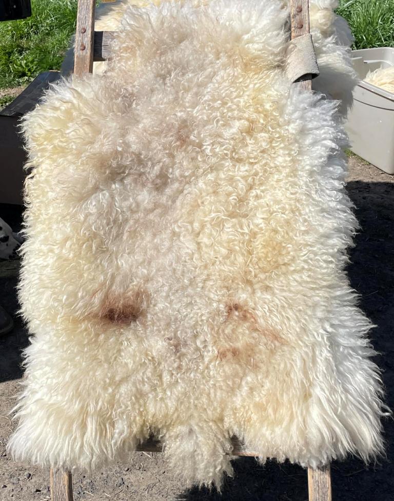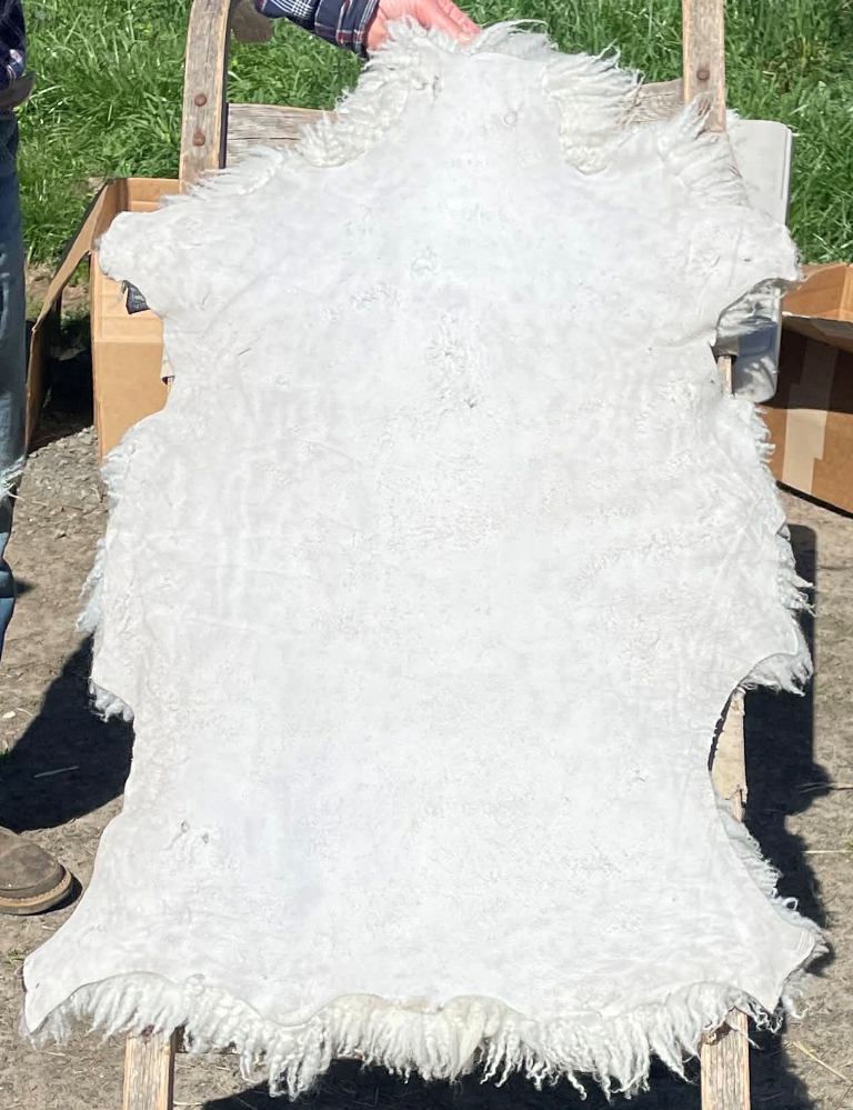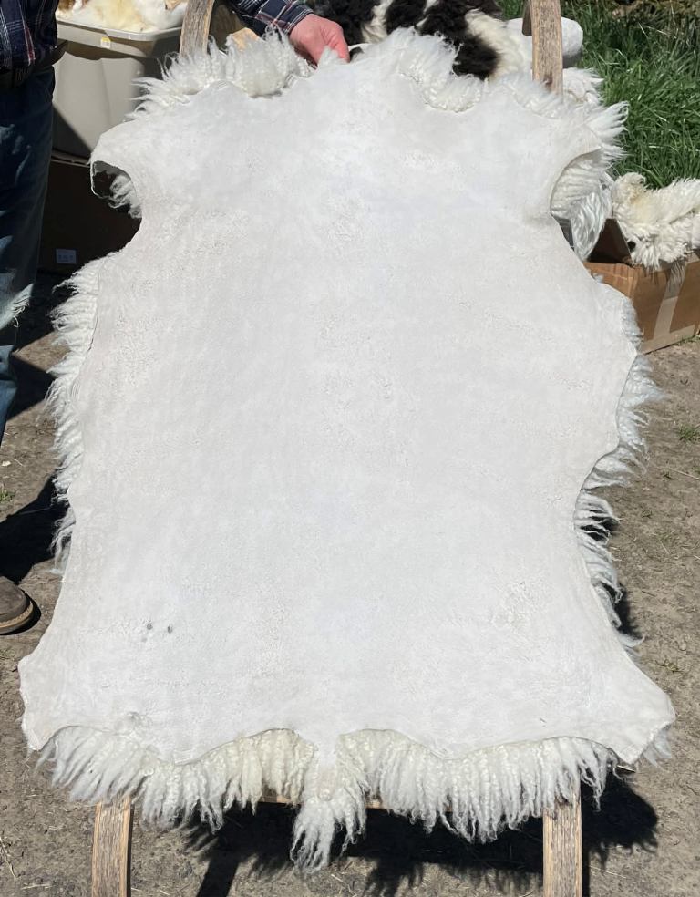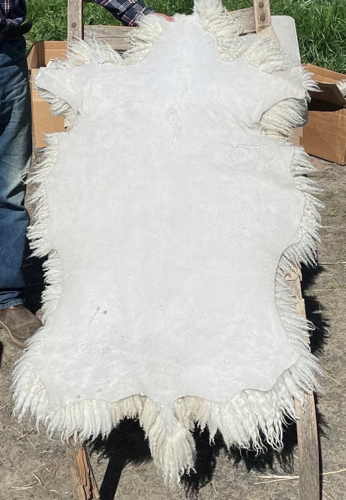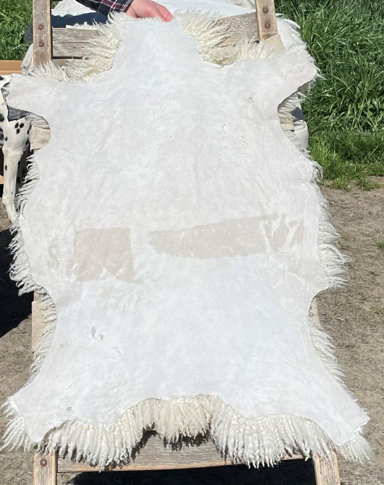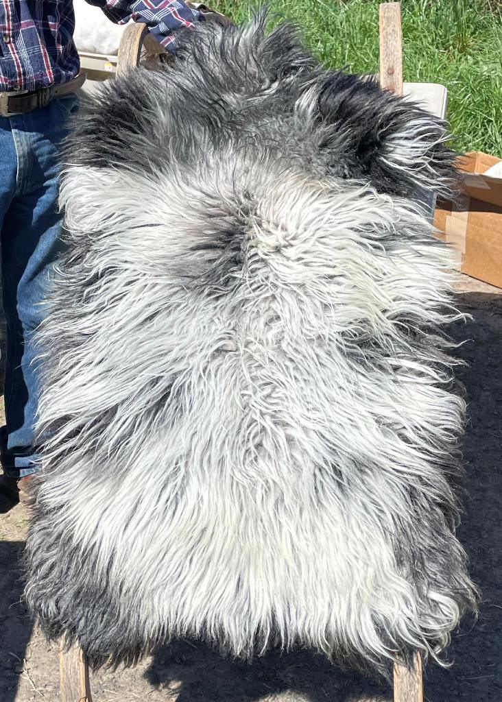 Pelt #B-X49 Border Leicester x Gotland x Navajo-Churro $350* Color: White Dimensions: 41"L x 31"W Lock Length: 4 1/2" - 5" Weight: 3 lbs 1 oz |