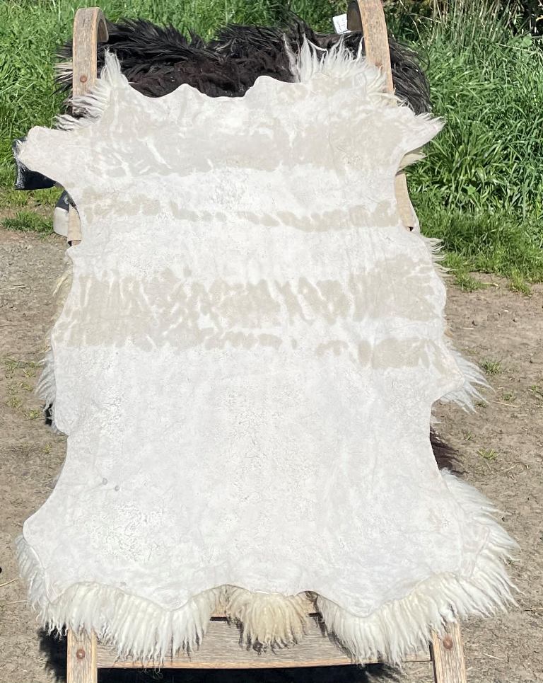 Pelt #S-BLX 8 Border Leicester x Gotland x Navajo-Churro $300* Color: White Dimensions: 42"L x 28" Lock Length: 4" Weight: 3 lbs 3 oz |